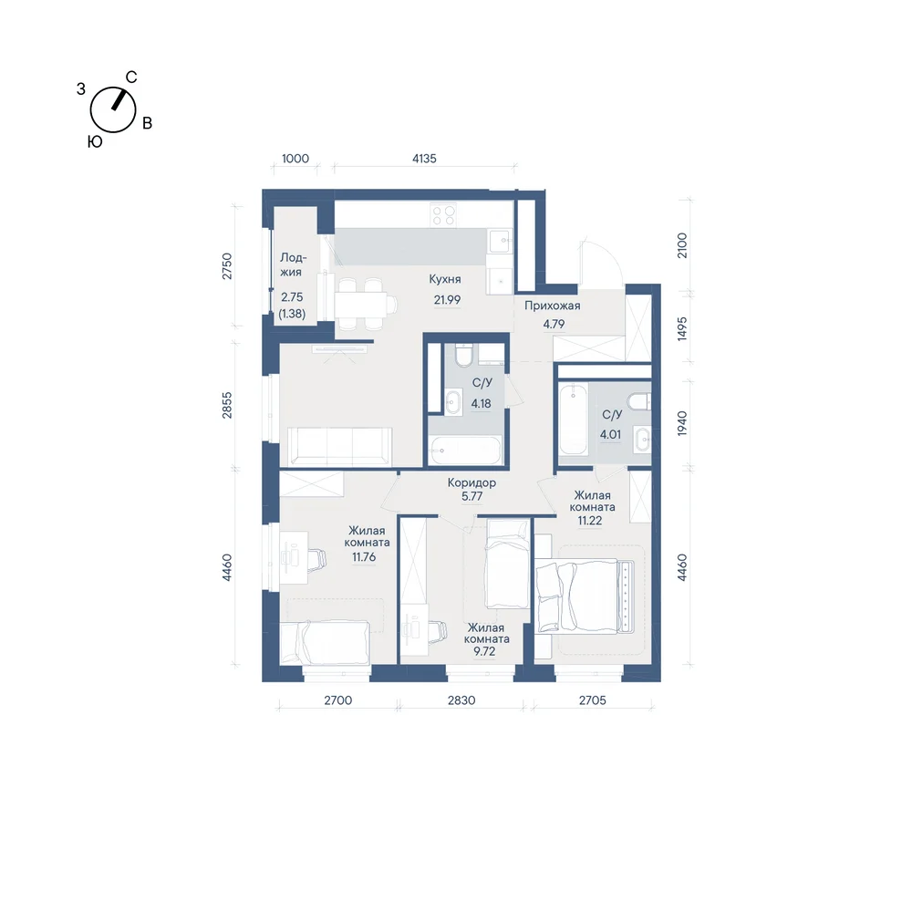 3-комнатная 74.82 м2