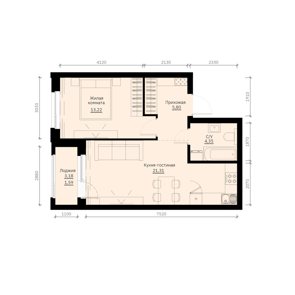 1-комнатная  46.27 м2